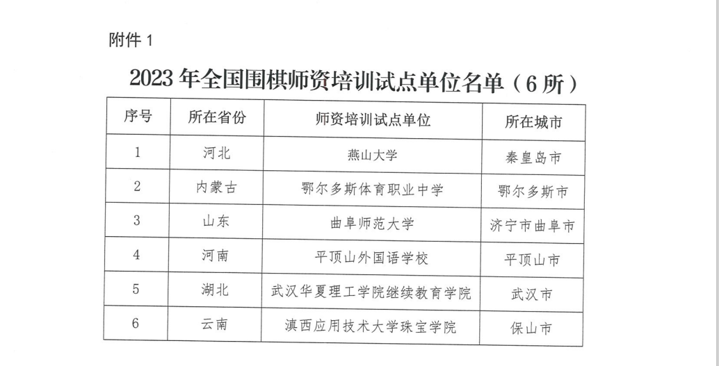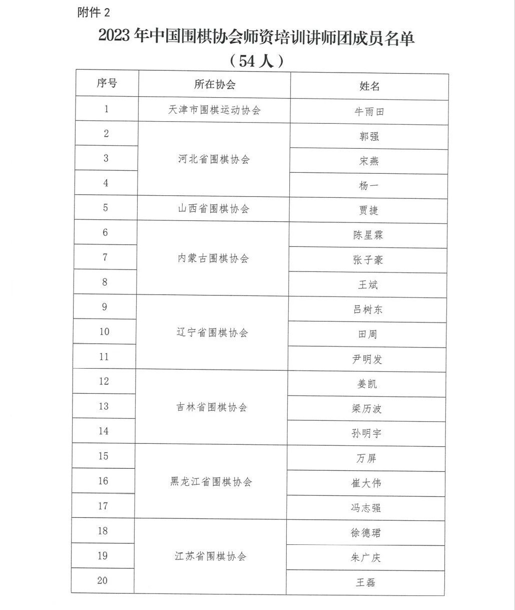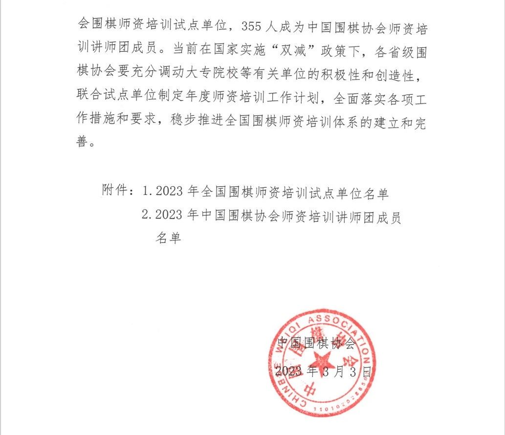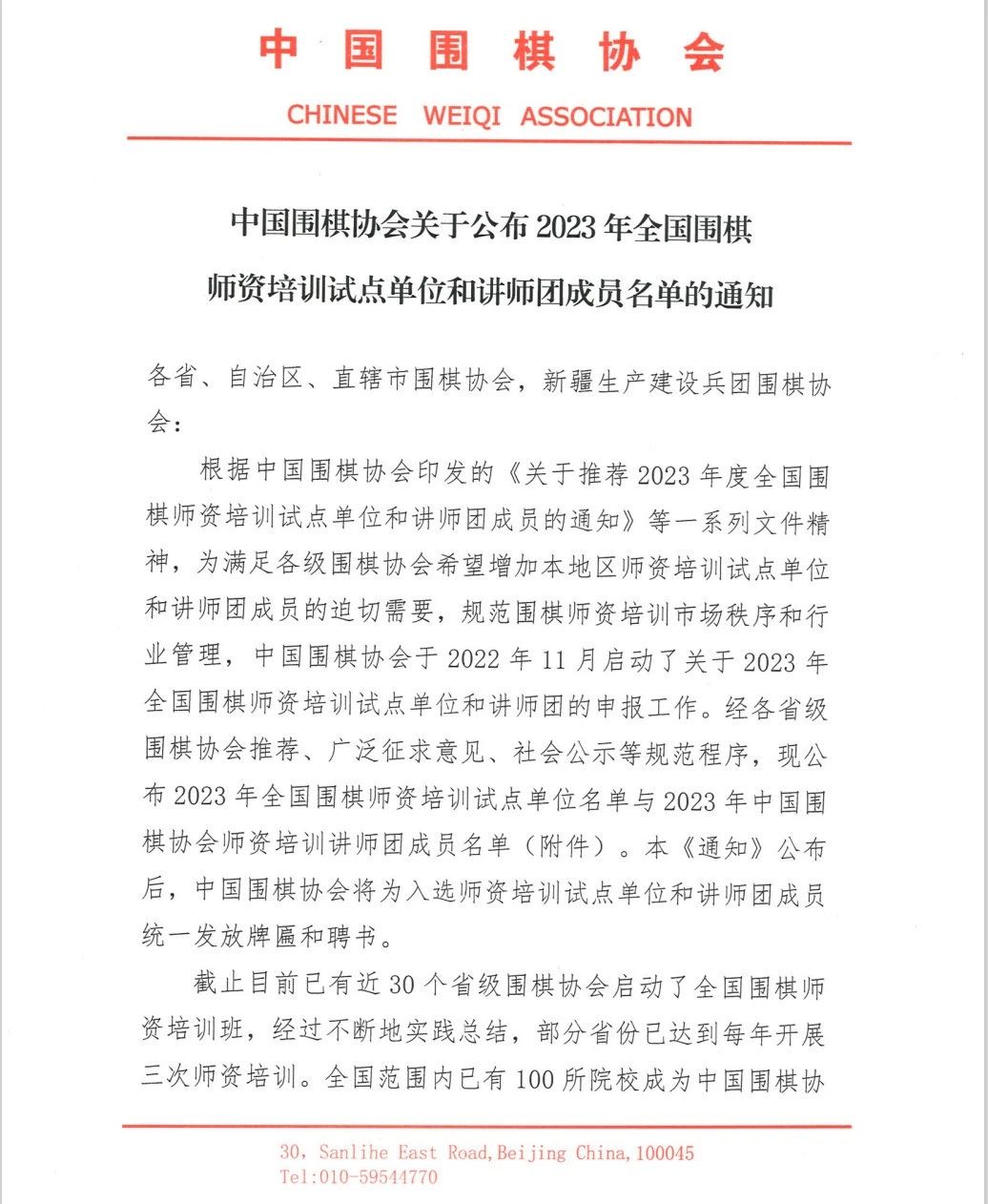 中国围棋协会关于公布2023年全国围棋师资培训试点单位和讲师团成员名单的通知