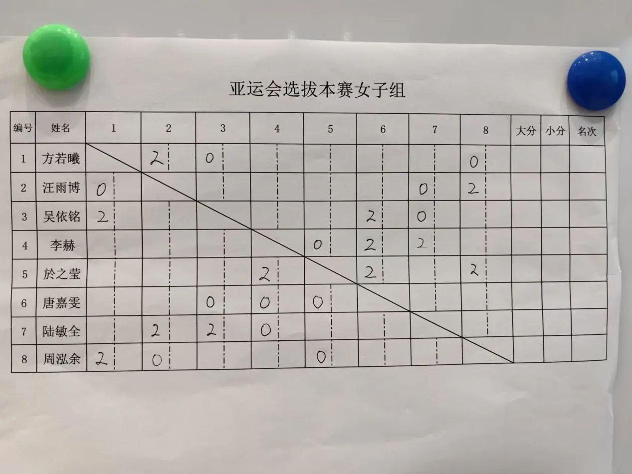 亚运女子组选拔分两个阶段进行。第一阶段共进行7轮积分循环赛,前四名方若曦五段、汪雨博五段、唐嘉雯四段、吴依铭四段出线,与2022年选拔赛最终出线的於之莹七段、周泓余七段、陆敏全六段、李赫五段一道晋级第二阶段。之后8名棋手通过双循环14轮积分赛,决出前四名代表中国参加杭州亚运会的资格。