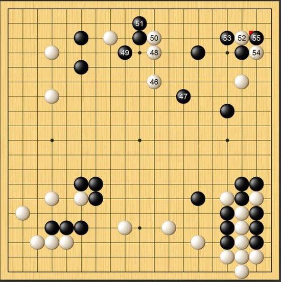 图二,八强战柯洁九段对杨楷文九段。从白46开始,柯洁看似要侵消大空,但白52、白54却又转至右上角活出,这样的思路能想象得到吗?
