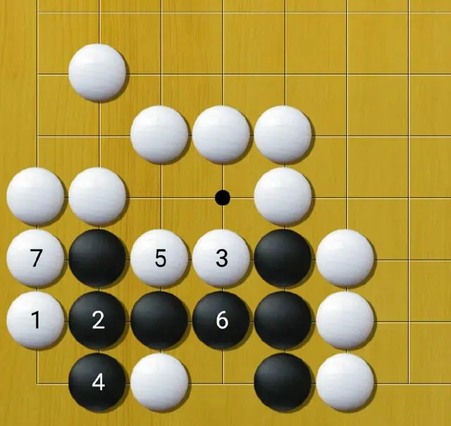 这里,黑4立下,白5提掉以后,黑6与白7成为见合,黑棋死。