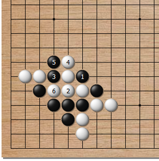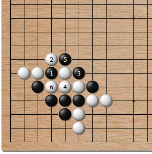 失败图,黑1打,白2接必然,黑3挖时白不在5位打,而是在4位长出,黑5长,白6挤断,黑棋崩溃,黑5如在6位接,则白棋在5位封锁黑棋即可,黑不满。