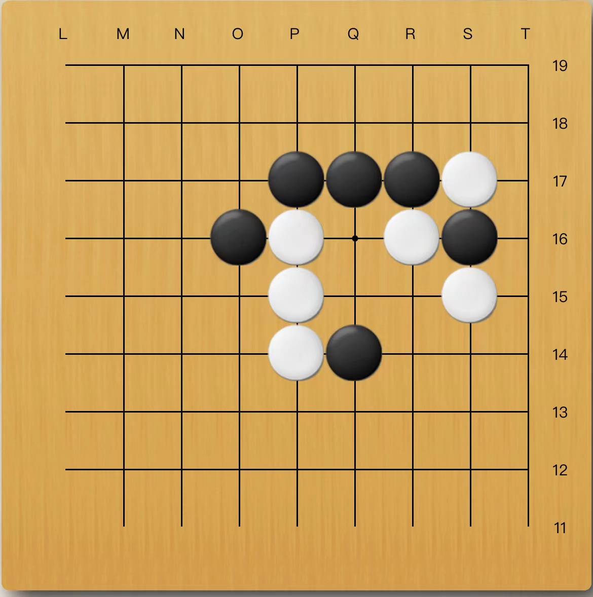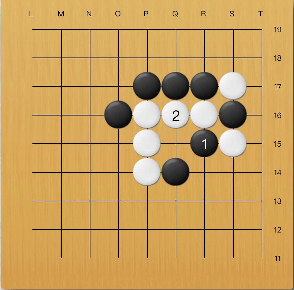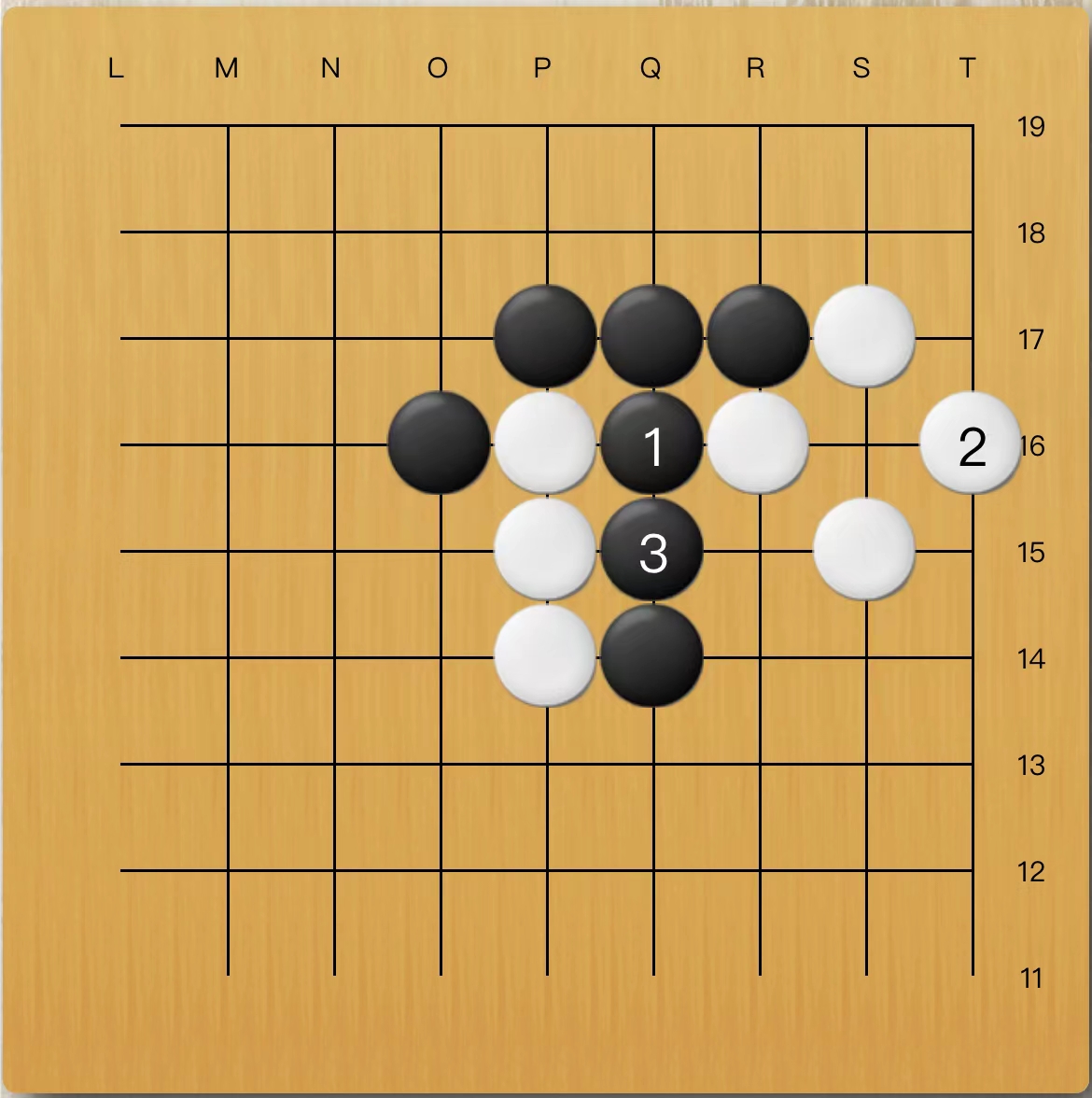 失败图,如果黑棋不经思考,直接叫吃白棋,那么白棋不会提子而是选择连接,这样所有的白棋都会连接,而外围黑棋支离破碎,难以再战。
