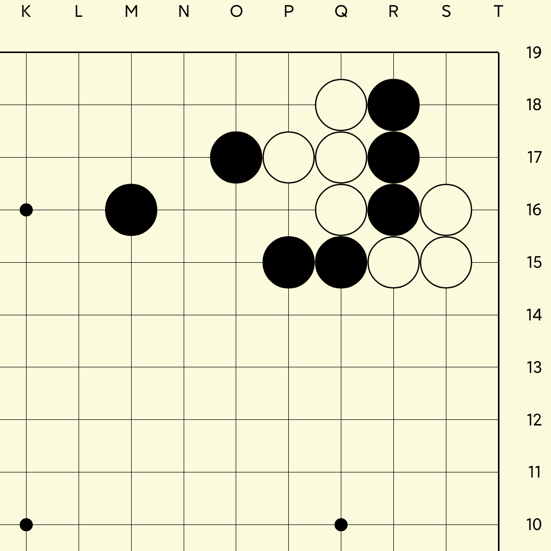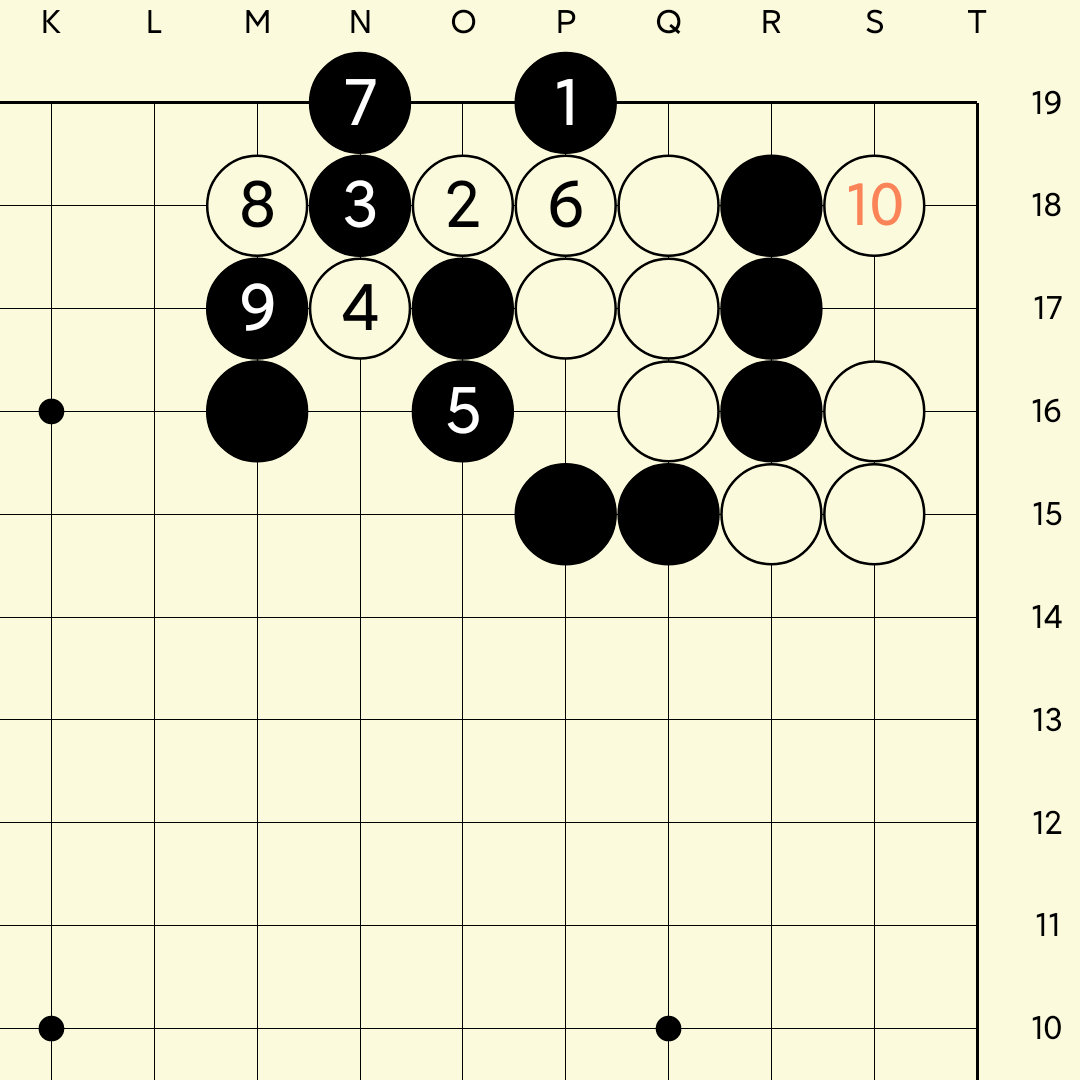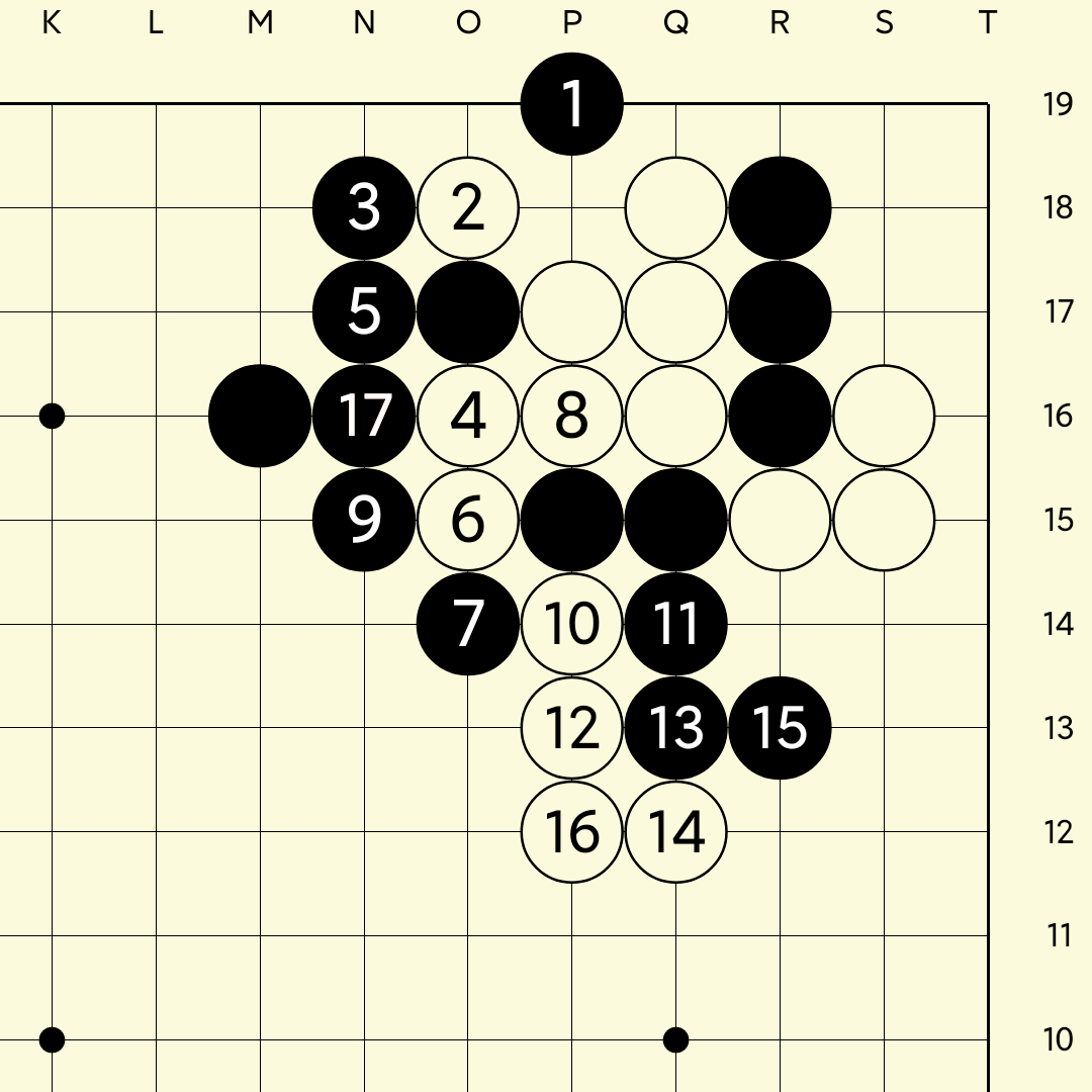 黑1飞点,所谓经典手筋,但AI会尖在3位,白10夹,黑P16紧气,白1位尖,黑2位团,白R19补,告一段落。