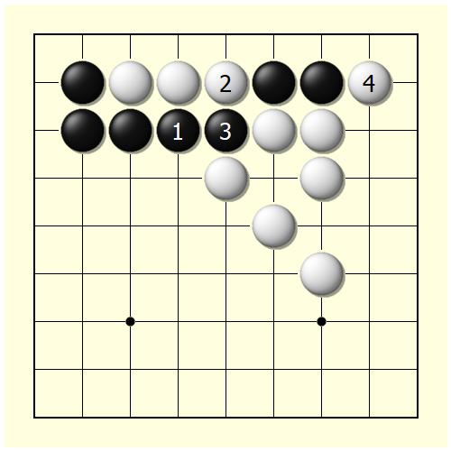 图四,白棋补掉自身毛病,黑棋顺利活棋,A、B见合。