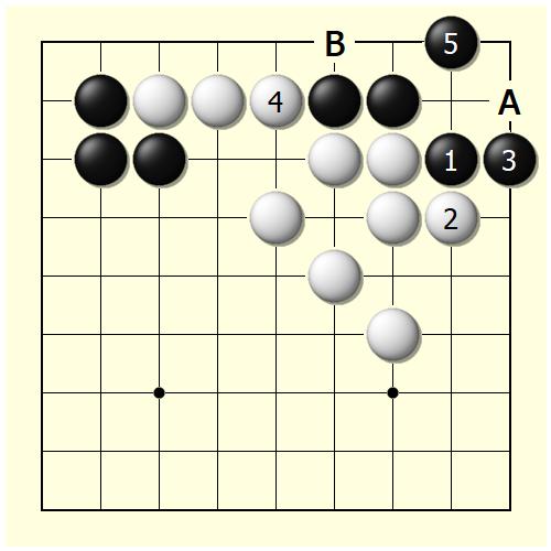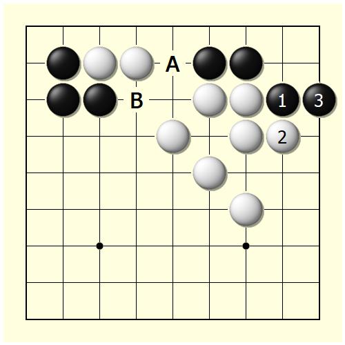 黑棋瞄着白棋A、B的弱点,现在角上求活,看白棋动静,好棋好思路。